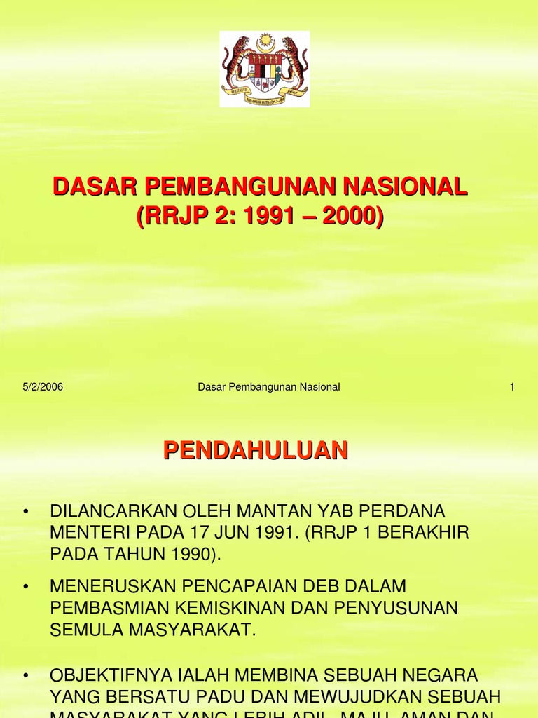 Dasar pembangunan nasional (dpn) merupakan dasar ekonomi malaysia yang telah dilancarkan oleh y.a.b. Dasar pembangunan nasional (dpn) dibawah rangka rancangan jangka panjang. Oleh karena itu, pembangunan nasional indonesia digerakkan disegala bidang, termasuk bidang politik, ekonomi, sosial dan budaya. Diperkenalkan oleh pentdbiran tun dr. 1.29 keseluruhan prospek pembangunan bagi rm6 dijangka terus menggalakkan.