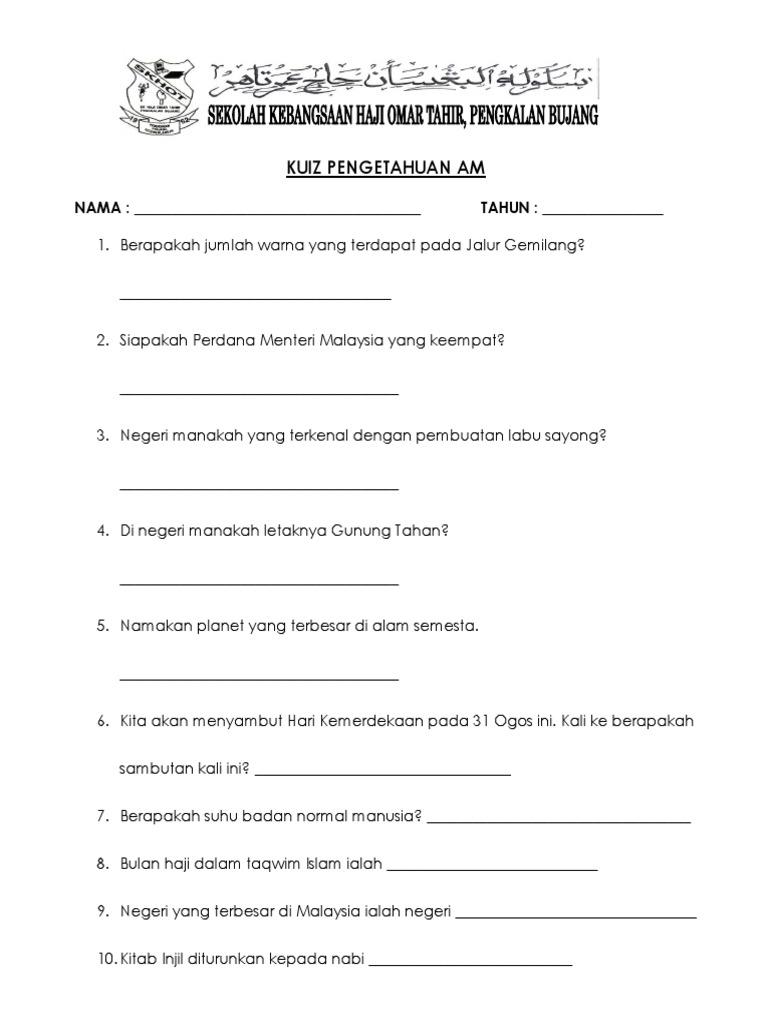 Kuiz yang sangat bagus untuk mempelajari dan mengasah kembali ilmu pengetahuan am negara malaysia. Kuiz pengetahuan am mari belajar. Nureen hamka 2 years ago. Kuiz ini akan menguji pengetahuan am dan sejarah tentang malaysia yang merangkumi pelbagai aspek soalan. Untuk menguji pemahaman pelajar terhadap subjek pengajian malaysia.