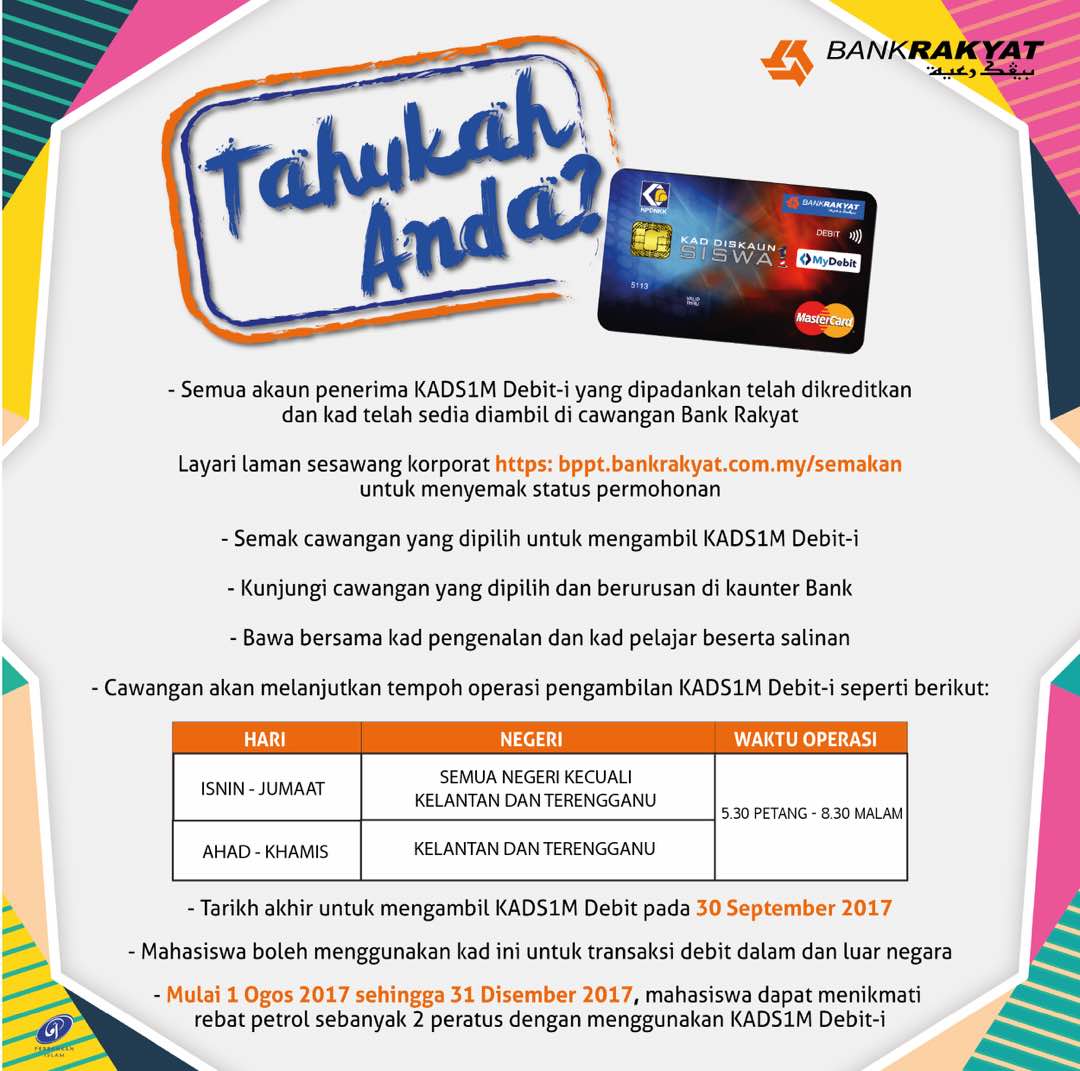 1 from Kad diskaun siswa 3 perkara yang diinginkan mahasiswa astro awani. Kad debit bank rakyat ini merupakan penambahbaikan daripada sistem baucar buku yang digunakan sebelum ini. Panduan buat pelajar institusi pendidikan tinggi (ipt) awam dan. Pinjaman peribadi bank rakyat whatsapp epayslip 019 2983056. Последние твиты от bank rakyat (@mybankrakyat). Cara daftar kad debit baucar buku 2017 di bank rakyat informasi santai. Status permohonan kad diskaun siswa bank rakyat. Bank kerjasama rakyat msia bhd.